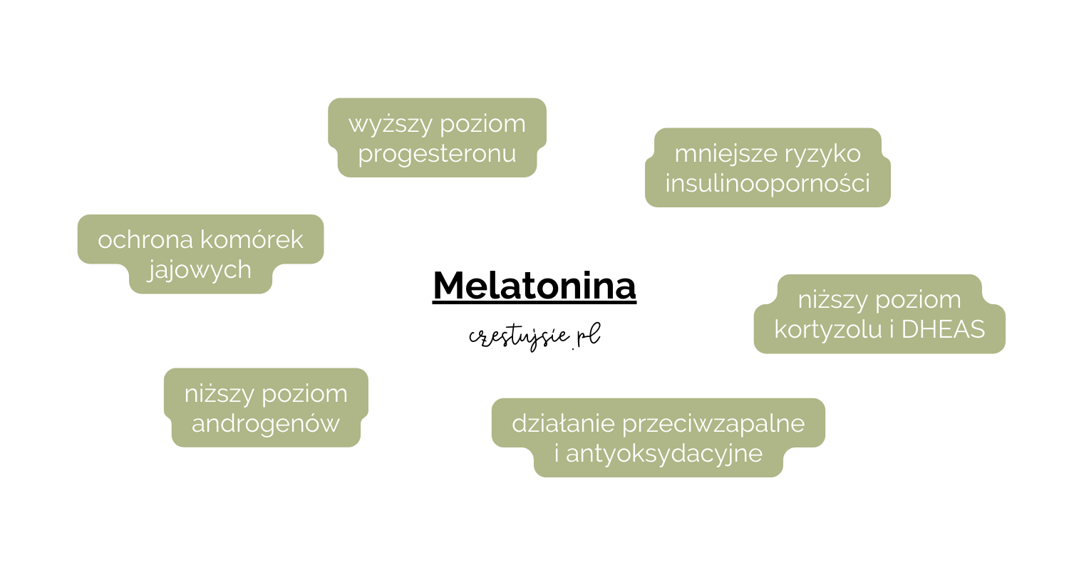 Melatonina (hormon snu), wytwarzana jest w szyszynce i bierze udział w regulacji rytmu dobowego. W badaniach zaobserwowano, że u pacjentek z PCOS dochodzi do obniżenia poziomu melatoniny w płynie pęcherzykowym. Melatonina jest silnym przeciwutleniaczem i skutecznym wymiataczem wolnych rodników, który chroni pęcherzyki jajnikowe podczas dojrzewania. Co więcej, wpływa na regulację cyklu miesiączkowego poprzez stymulowanie produkcji progesteronu i pomaga w obniżeniu poziomu androgenów. Zaburzenie rytmu dobowego i niedobór melatoniny są związane z wyższym ryzykiem insulinooporności i zaburzeń metabolicznych. W pierwszej kolejności warto zadbać o produkcję naturalnej melatoniny w organizmie, a więc skupić się na higienie i jakości snu. W niektórych przypadkach warto jednak rozważyć suplementację, szczególnie że u kobiet z PCOS częściej występują problemy ze snem.
